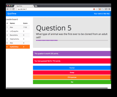 The game itself is pretty simple. People join the “room” by going to http://qu.izti.me on their device. Large displays will show a leaderboard along with the game, and small displays (such as phones) will act as personal gamepads. Users will see questions and a choice of answers. The faster you answer, the more points you earn.