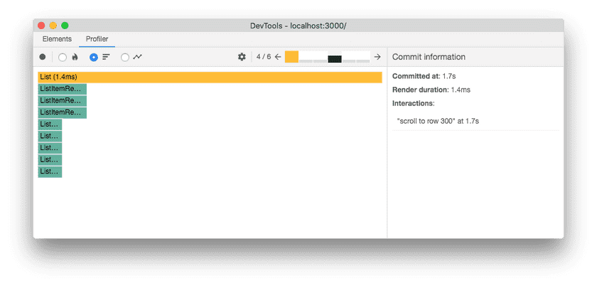 The longer you profile, the more times your application will render. In some cases you may end up with too many commits to easily process. The profiler offers a filtering mechanism to help with this. Use it to specify a threshold and the profiler will hide all commits that were faster than that value.