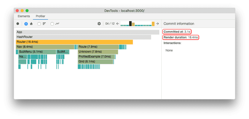 For example, the commit shown above took a total of 18.4ms to render. The Router component was the “most expensive” to render (taking 18.4ms). Most of this time was due to two of its children, Nav (8.4ms) and Route (7.9ms). The rest of the time was divided between its remaining children or spent in the component’s own render method.